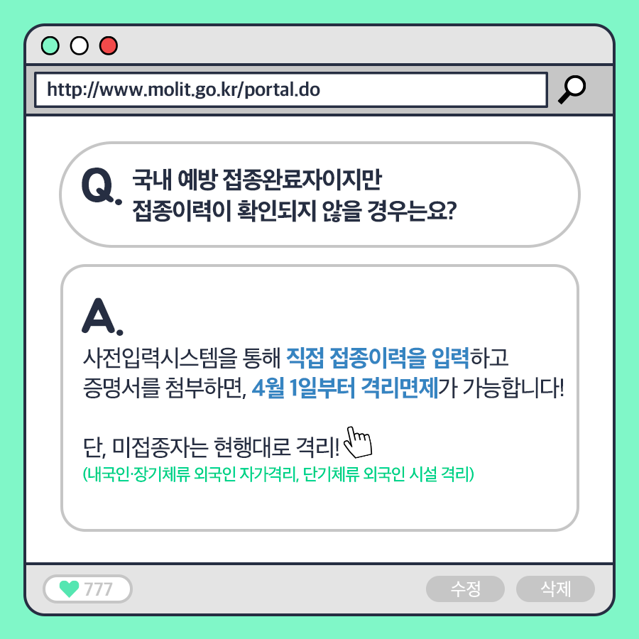 접종 이력을 등록한 자*에 한해 격리를 면제합니다.