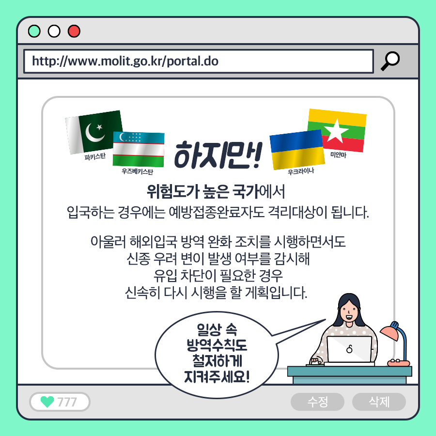 입국하는 경우에는 예방접종완료자도 격리대상이 됩니다.